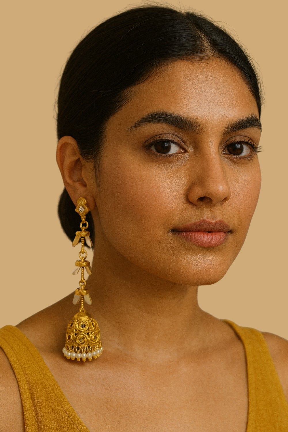 Graceful and traditional, the LAMJI earrings showcase a beautifully detailed long-drop jhumka design. Crafted in a rich antique gold tone, they feature a floral top stud with delicate diamond-like stone accents, followed by cascading elements that resemble temple bells or leaves. The intricately carved dome-shaped jhumka at the bottom is edged with fine pearl drops, adding a timeless charm. These earrings are perfect for classical looks, temple wear, or any festive occasion.