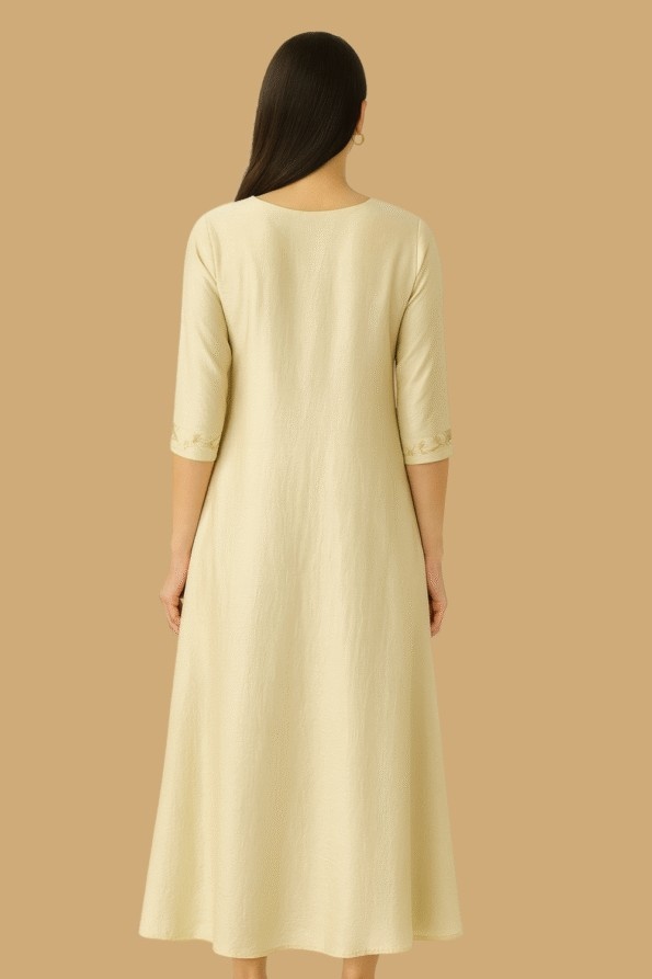 This elegant Mod Salwar (Code 12-905) is crafted from premium Chanderi fabric, designed in a graceful A-line silhouette that ensures both comfort and style. The outfit features a square yoke with intricate handwork design, adding a refined traditional touch. A beautifully finished V-neckline with scallop detailing enhances its feminine charm. The sleeves are highlighted with a rich Banarasi border, giving the dress a regal appeal. Perfect for festive occasions, weddings, and family gatherings, this dress blends tradition with timeless elegance.