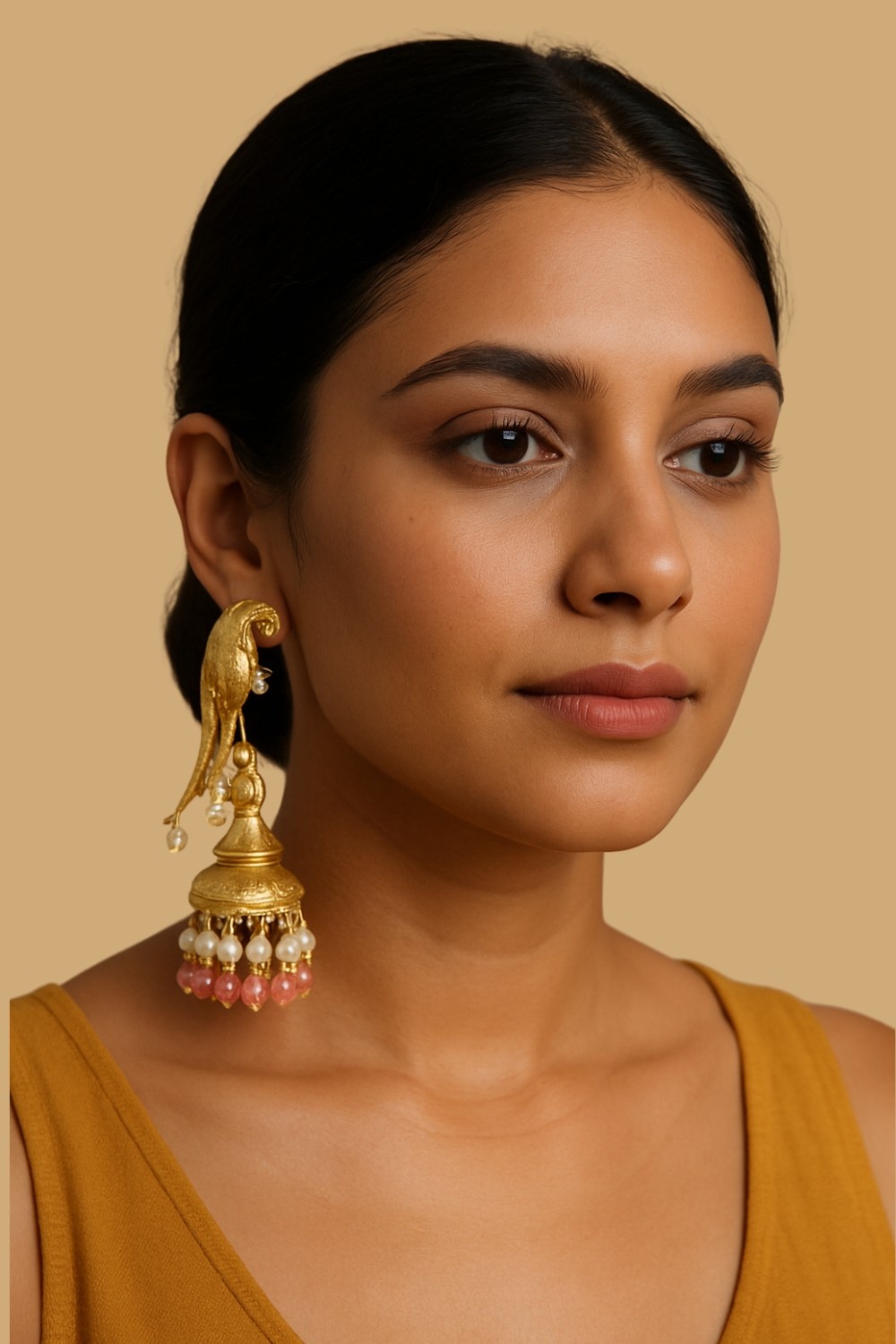 Golden Parrot Jhumka Earrings featuring an antique gold parrot motif with red stone eyes, paired with dome-shaped jhumkas adorned with white pearls and soft pink beads — perfect for weddings and festive occasions.