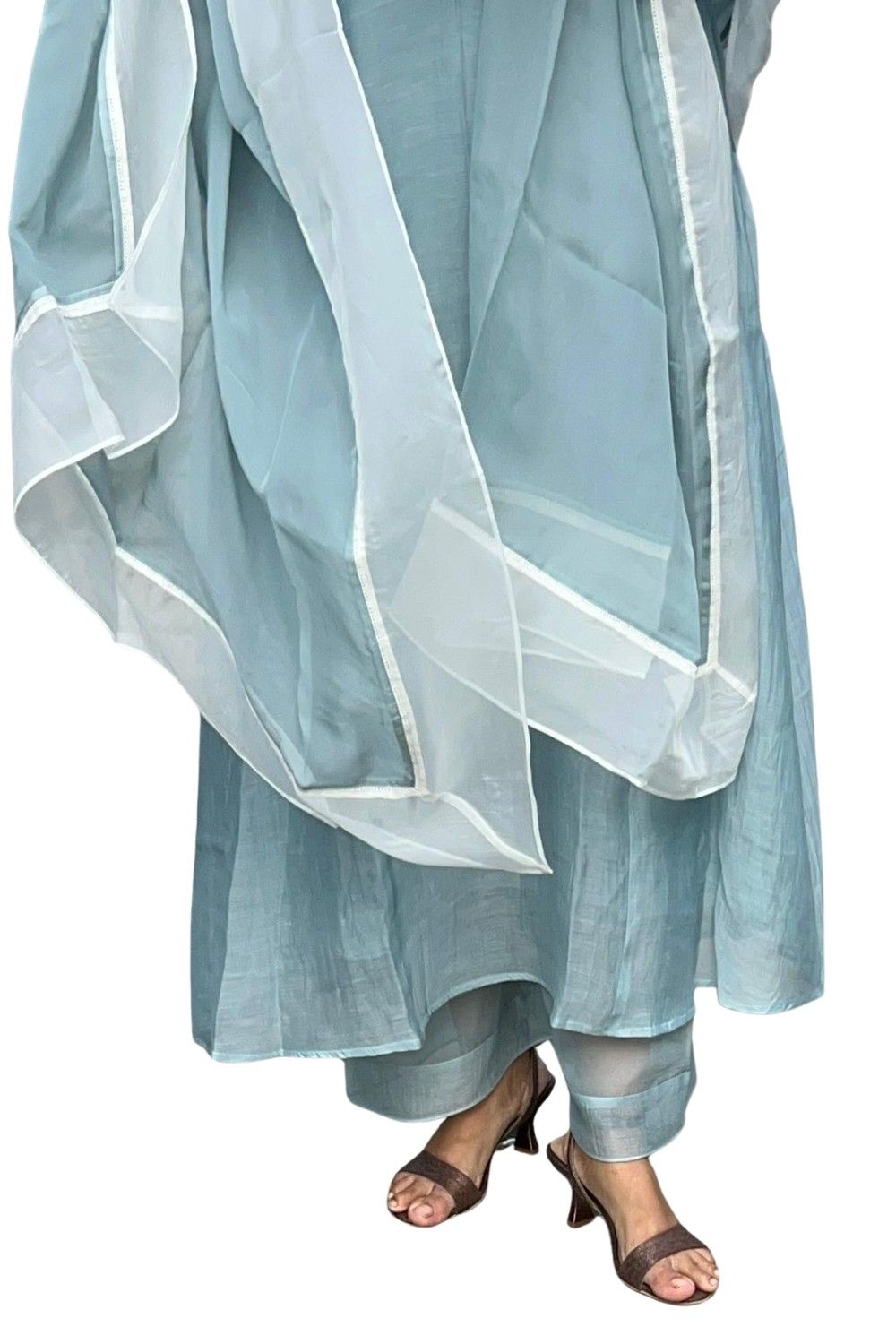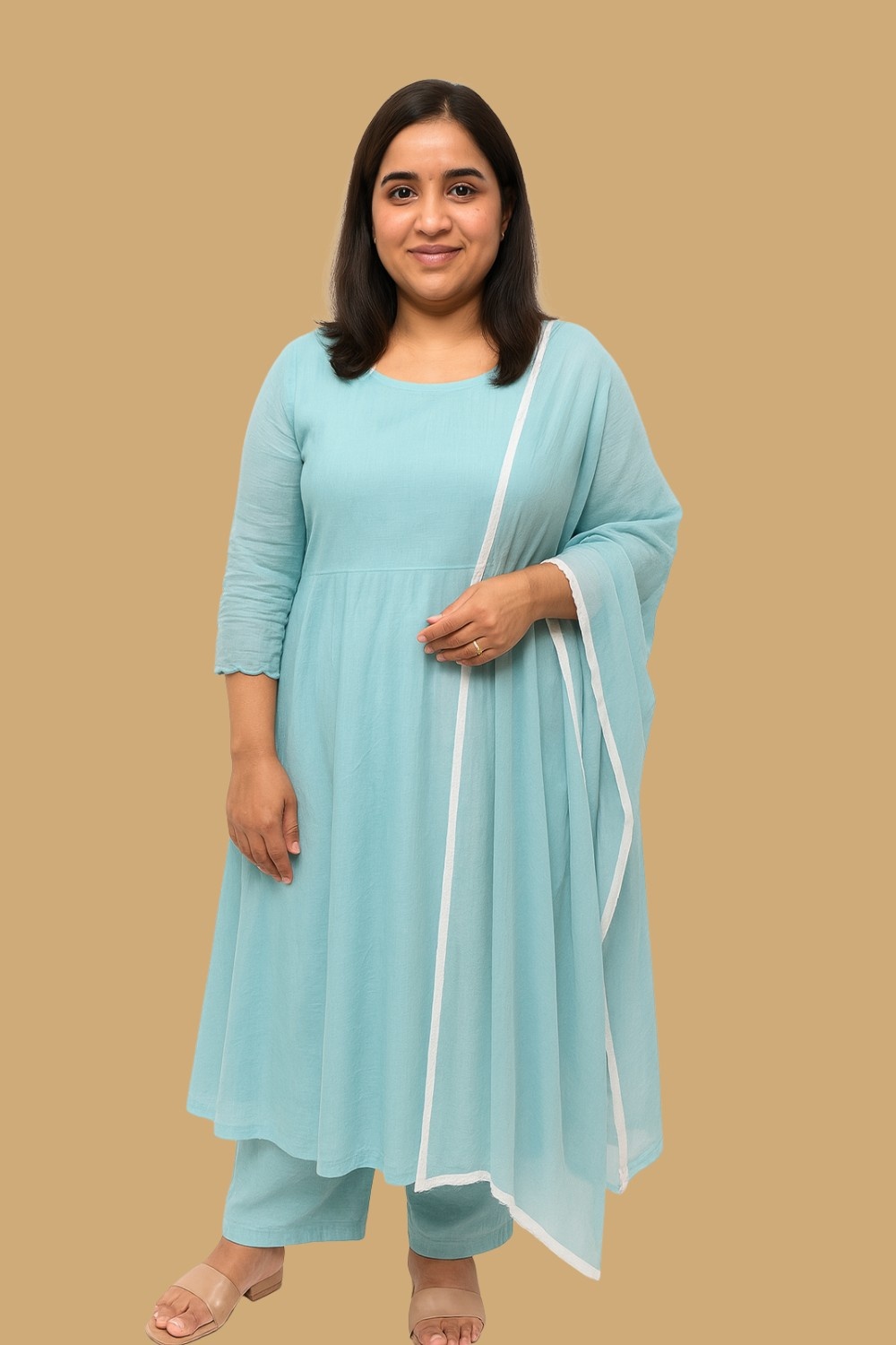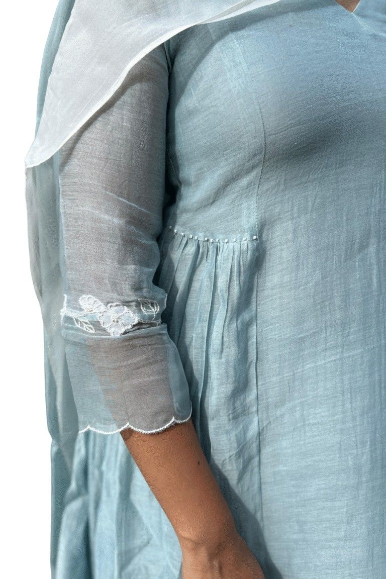 This Elegant Sky Blue Cotton Anarkali Suit Set exudes timeless charm with its flowing silhouette and minimalistic design. Crafted from breathable cotton, the Anarkali kurta features a flattering V-neckline and soft gathers below the bust for a relaxed fit. The 3/4th sleeves are adorned with subtle lace and sheer panel detailing for added sophistication. Paired with a sheer white dupatta with fine white edging, this ensemble is ideal for casual wear, light festive occasions, or intimate gatherings. Style it with delicate jewelry and flats for an effortlessly graceful look.