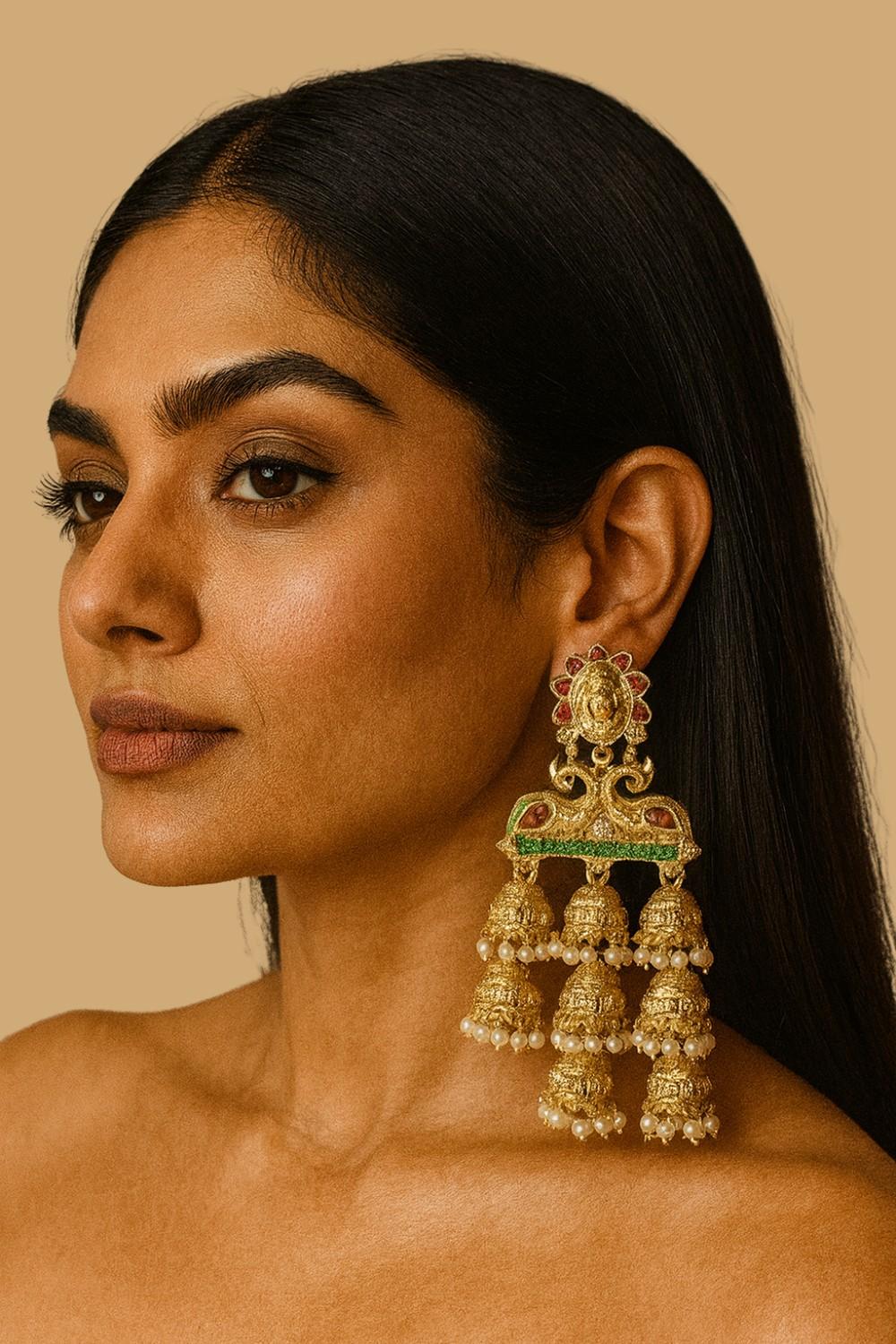 • Design: Traditional triple-jhumka danglers